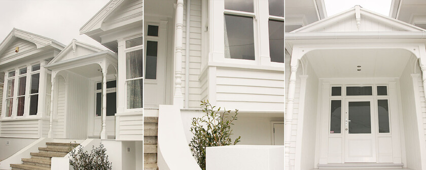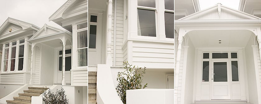 Cracking, flaking and blistering paint featured across the exterior and extensive preparation was needed to ensure the surfaces would be adequately sound to receive the new coats of paint. Almost all the weatherboards were painstakingly stripped back to ensure this.