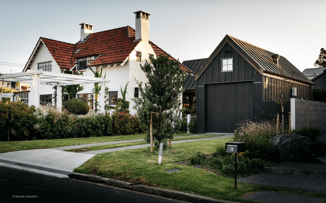 This home, next to Takapuna Beach, was originally an arts and crafts cottage. Craving more space, the homeowners added an extension, including a garage, kitchen, butler’s pantry, dining area and a deck with a fireplace.